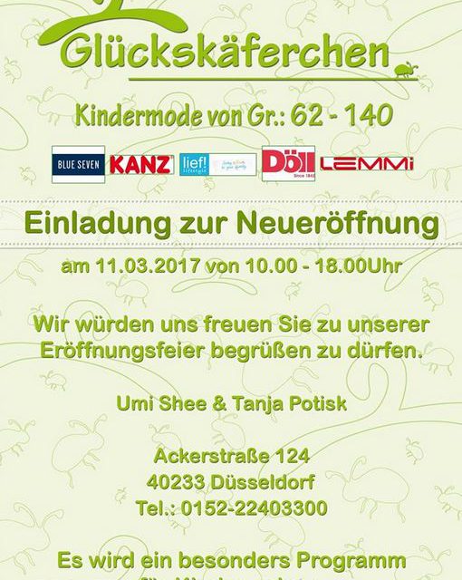 Tanja Potisk, Inhaberin der Kinderbutique „Pofines Lädchen“ (Ratingen Hösel), eröffnet gemeinsam mit Umi Shee einen weiteren Kindermodeladen, im angesagten Düsseldorfer Stadteil Flingern. Ihr seid alle herzlich eingeladen. Hier werden die Kleine-Spatzen natürlich auch vertreten sein. Und zu diesem besonderen Anlass, heben wir uns auch ein passendes Motiv ausgedacht,welches es erstmalig zur Eröffnung im Glückskäferchen zu erwerben gibt.
